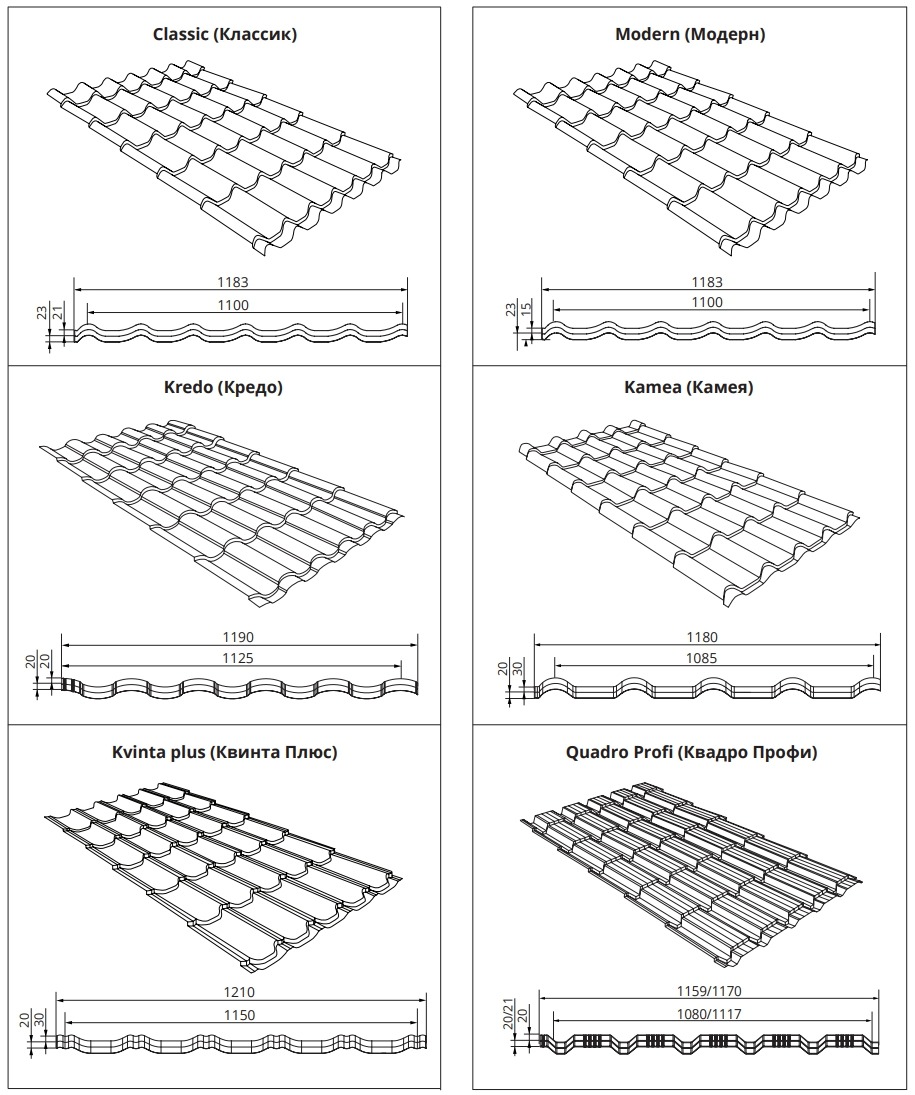 Профиль металлочерепицы это не классическая синусоида. Изгибы волны могут быть плавными, со ступенькой, наклонными, с плоской подошвой или выраженной вершиной.